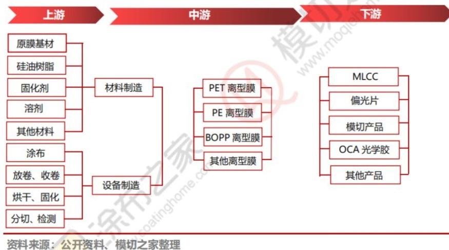 上游主要為原膜基材和離型劑等原材料。離型劑主要以有機硅離型劑為主,輔以有機氟離型劑及其他一些非硅離型劑。涂布材料的質(zhì)量和配比會直接影響到產(chǎn)品的質(zhì)量和性能。由于基膜和功能性涂料供應(yīng)相對充分且市場較為成熟,因此離型膜對上游的依賴性較小。