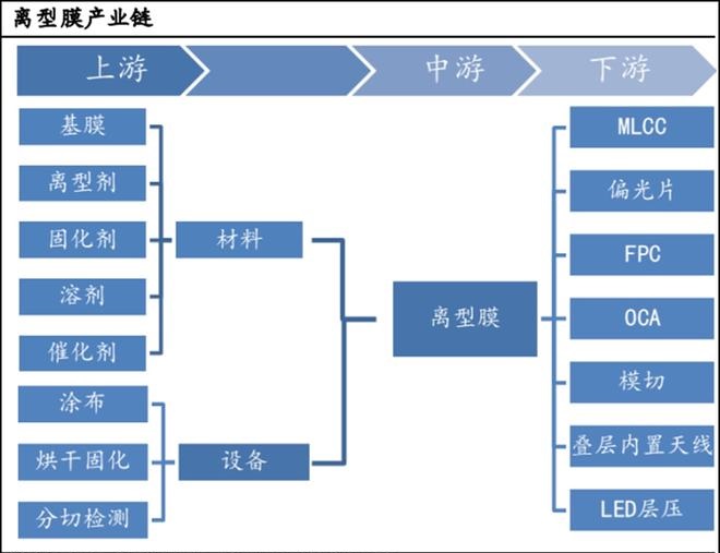 離型膜下游有:多層陶瓷電容器(MLCC)、偏光片、柔性印刷電路板(FPC)、觸摸屏 OCA、LED 層壓隔離膜及保護(hù)膜、模切行業(yè)沖型耗材、疊層內(nèi)置天線等,其中MLCC 與偏光片為離型膜主要下游。