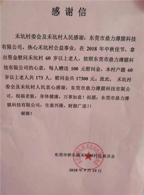 發(fā)布時間:2018-09-29 | 信息來源:東莞市鼎力薄膜科技有限公司 | 點擊量:125“百事孝為先”關愛老人是是中華民族的傳統(tǒng)美德,關愛老人,從你我做起,從身邊事做起,在此,東莞市鼎力薄膜科技有限公司全體同仁祝愿老人們身體健康、萬事如意!